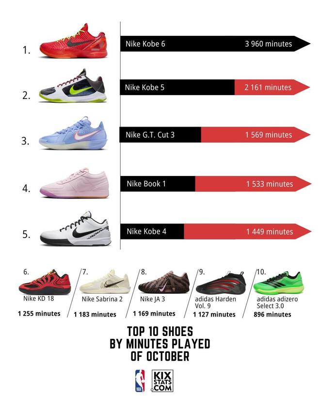 北京时间11月3日,美国球鞋媒体Kixstats对10月份球星上脚球鞋进行了数据统计,据统计显示,在10月份的比赛中,科比6代成为NBA球员选择最多的篮球鞋。